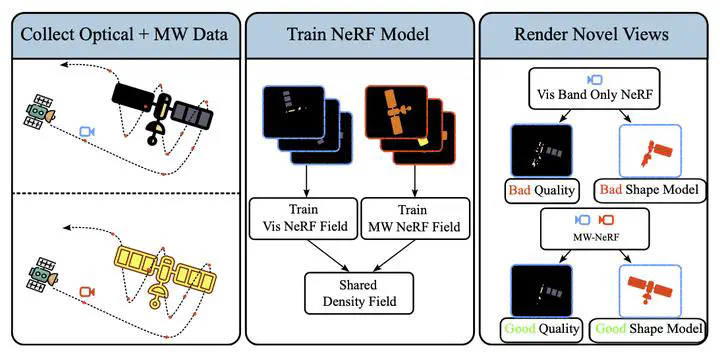 The future of Neural Radiance Fields (NeRFs) within aerospace applications relies heavily on their ability to cope with the hostile observing conditions that permeate space-based operations. While existing NeRF models can handle many real-world scenes with extremely fine detail, they still lack robustness to the extreme lighting conditions present outside of Earth’s atmosphere. While optical light may not contain all the information required to faithfully reconstruct a scene, we propose that this problem can be tackled by creating a new NeRF architecture that can process images taken at different wavelengths, where vital shape information may be readily available. This work explores our new proposed model, multi-wavelength NeRF (MW-NeRF), along with a large realistic dataset suite containing simple to complex satellite geometries with multiple different lighting conditions, taken over several different target ranges. Early analysis of our model shows that dark regions in these datasets prove difficult for optical training alone to overcome, and that better underlying shape models can be learned when provided with multi-wavelength datasets.